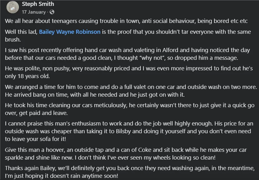 At Robbo’s Valeting, we don’t just clean cars, we take pride in every detail. Bailey’s built this business on trust, reliability, and high standards.